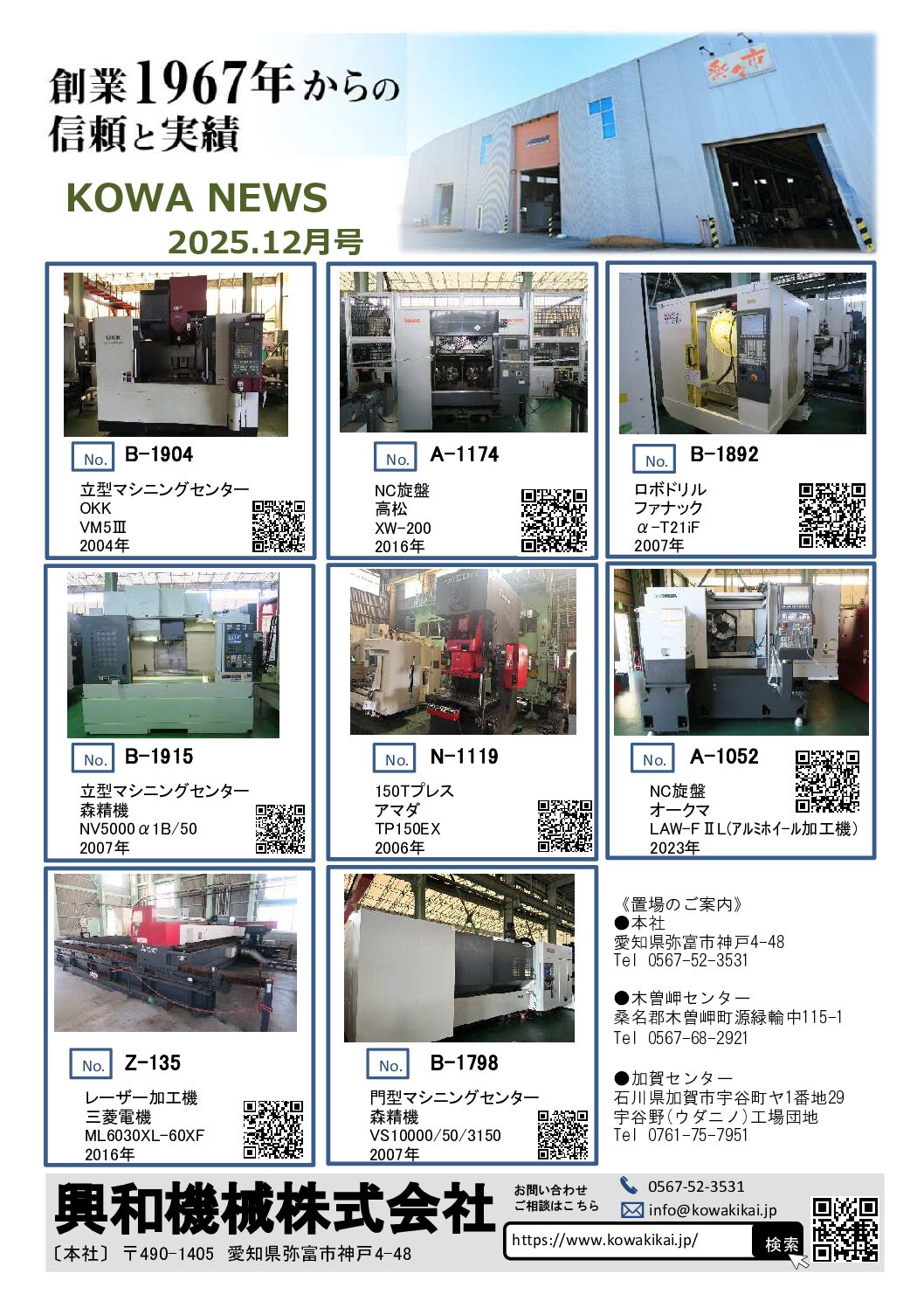 お世話になります。 KOWA NEWS 12月号(弊社在庫表)を発行しました! 気になる機械がございましたら、お気軽にお問合せください。 KOWA NEWS 12月号 お問合せこちら…